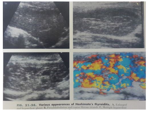 – Siêu âm: Tuyến to ra với cấu trúc echo thô và giảm âm hơn so với nhu mô tuyến bình thường (Hoặc có nhiều chấm nhỏ giảm âm).