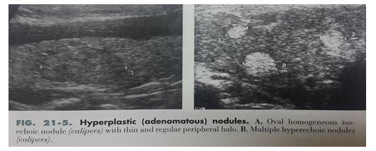 – Phần lớn nốt tăng sản tuyến: Đồng âm với nhu mô tuyến giáp bình thường. Khi kích thước nốt tăng lên cấu trúc âm tăng (Hyperechoic) với viền giảm echo mỏng. Trên doppler có mạch máu xung quanh.