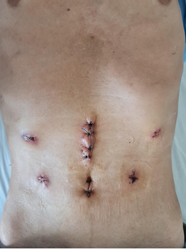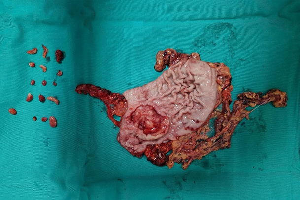 Bệnh nhân được thực hiện phẫu thuật nội soi cắt dạ dày ngày 26/5/2021, ca phẫu thuật thực hiện kéo dài 4 tiếng rưỡi, u ở mặt sau hang môn vị dạ dày chưa xâm lấn qua thanh mạc chưa thấy di căn các cơ quan khác trong ổ bụng. Tiến hành nội soi cắt ¾ dạ dày nạo vét hạch thuận lợi, rạch da đường trắng giữa trên rốn khoảng 6cm cắt dạ dày lấy bệnh phẩm và nối dạ dày hỗng tràng kiểu Finsterer.