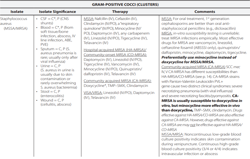 + MRSA là các chủng S.aureus đề kháng với Methicillin. Các chủng MRSA sẽ đề kháng với cả các kháng sinh β-lactam hiện có, ngoại trừ Cephalosporin thế hệ mới có hoạt chính chống lại MRSA (Cephalosporin thế hệ 5).