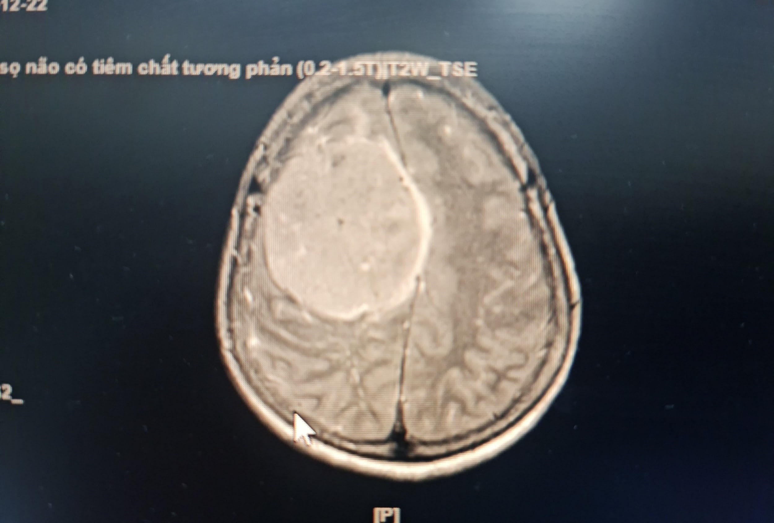 Kết quả thăm khám và chụp MRI sọ não có tiêm thuốc tương phản tại Bệnh viện Đa khoa tỉnh Thanh Hoá phát hiện bệnh nhân có khối u màng não bán cầu phải, kích thước lớn 7x8cm. Khối u nằm sát, xâm lấn xoang tĩnh mạch dọc giữa và 1 phần xương sọ, gây chèn ép ¼ não và phù não xung quanh. Bệnh nhân và người nhà được các bác sĩ tư vấn cần sớm phẫu thuật điều trị, vì khối u lớn sẽ chèn ép, gây nhiều tổn thương nghiêm trọng đến nhiều chức năng của cơ thể bệnh nhân như: vận động, thị giác, nhận thức,… và thậm chí có thể tử vong.