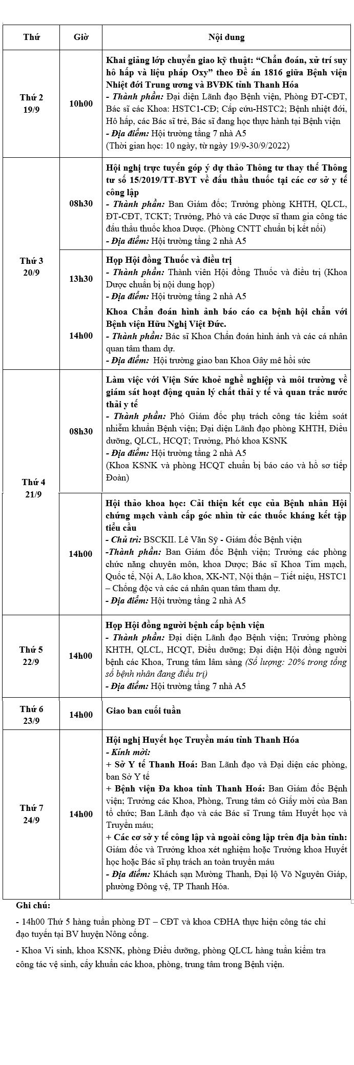 Lịch công tác tuần từ ngày 19/9/2022 đến ngày 24/9/2022 Tài liệu đi kèm:Lịch công tác tuần (File word)