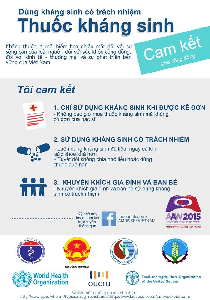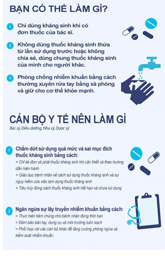 Theo đó, WHO kêu gọi mỗi cá nhân, tập thể cần nâng cao nhận thức về việc sử dụng kháng sinh. Cụ thể: